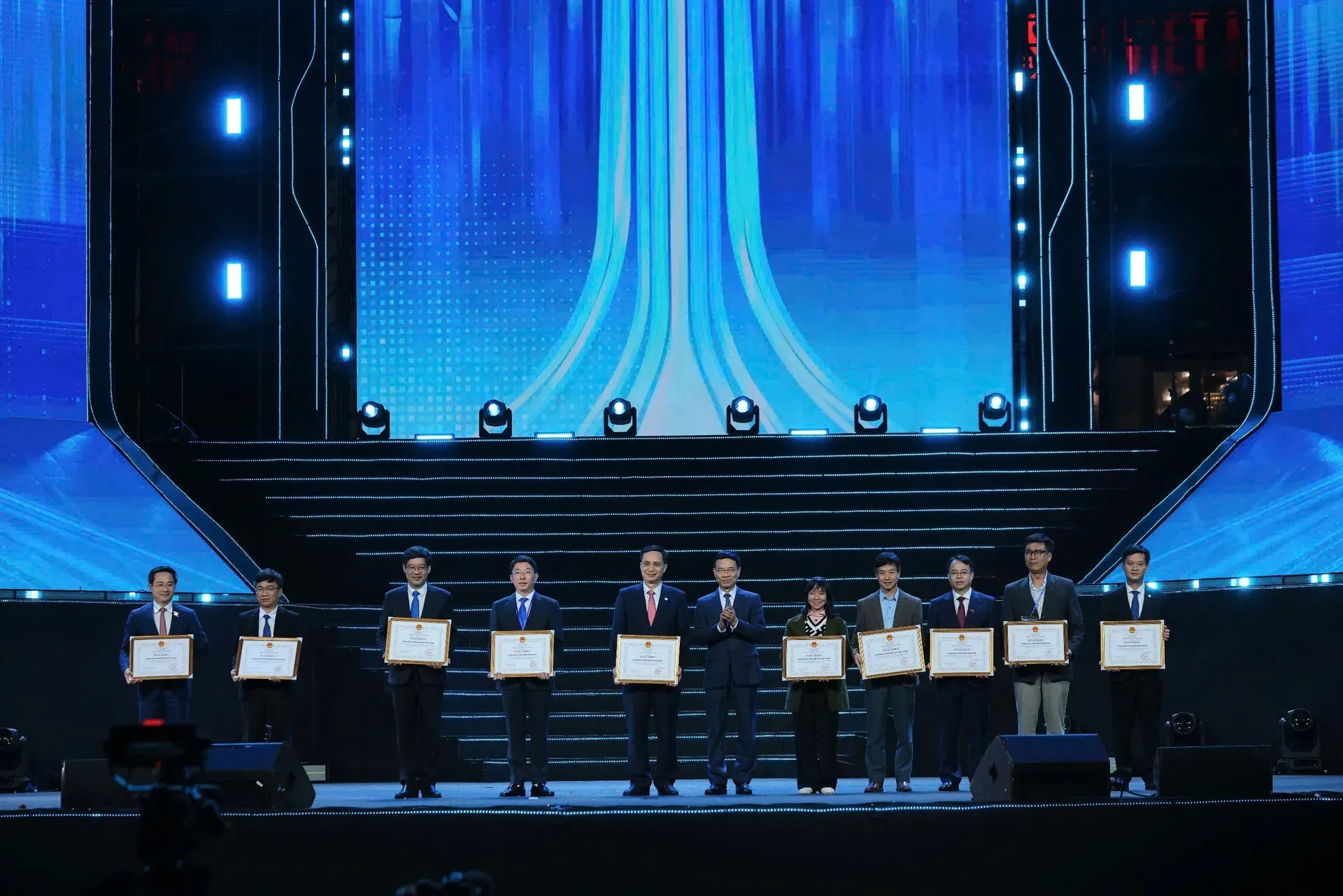 Minister of Science and Technology Nguyen Manh Hung (center) gives certificates to 10 outstanding localities for their development of the innovative startup ecosystem in 2025.