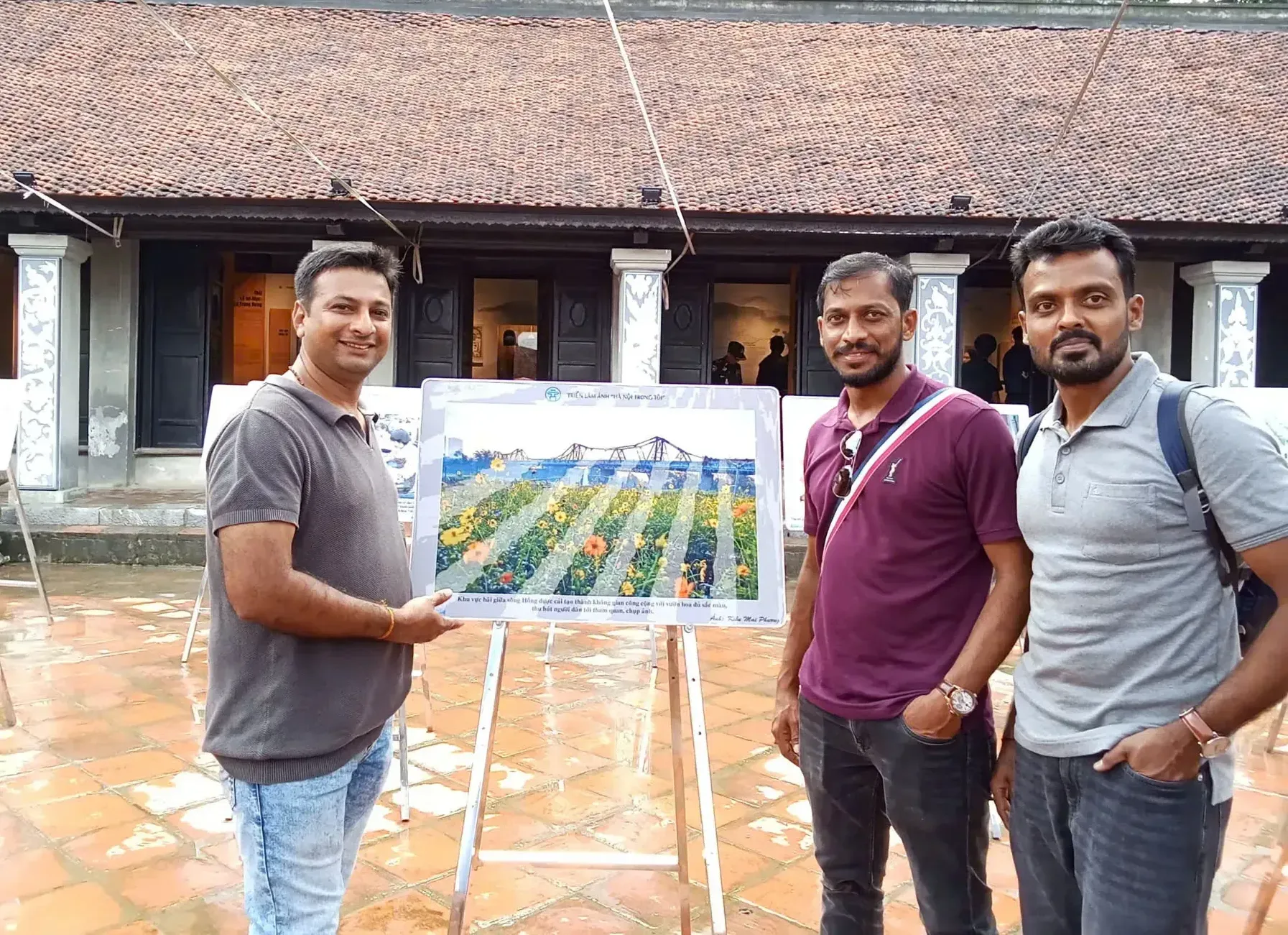 Shachi, Harish, and Sachin, tourists from India's Karnataka, capture the moment next to a photo of Long Bien Bridge.