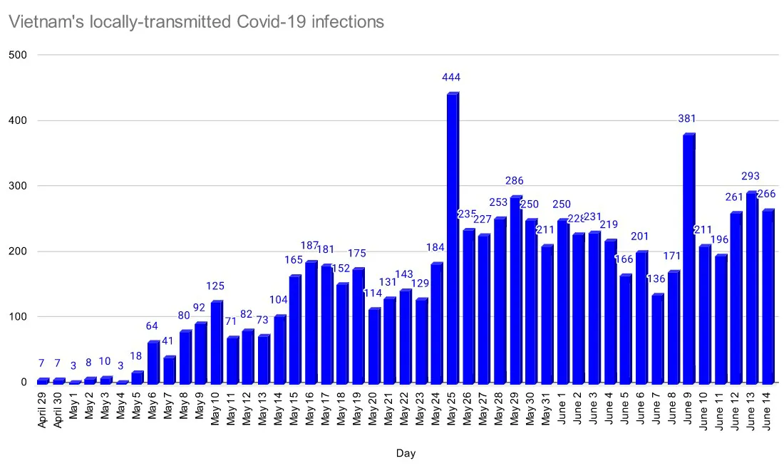 | Vietnam's Covid-19 infections. Source: MoH. Chart: Minh Vu |