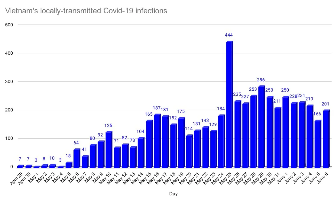 | Vietnam's locally-transmitted Covid-19 infections. Source: MoH. Chart: Minh Vu |