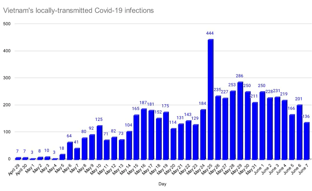 As of June 7, Vietnam has confirmed 8,983 infections, including two-thirds were detected in the ongoing outbreak that flared up in late April. The death toll has stayed at 53.