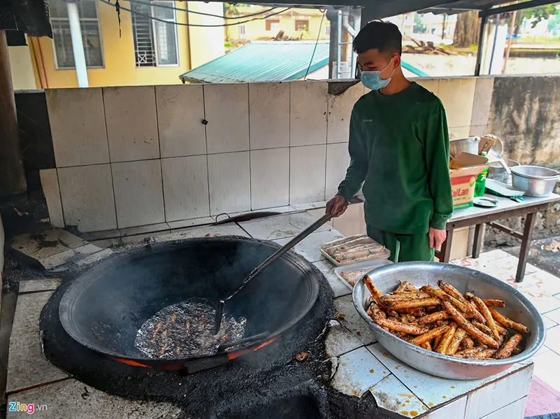 The food regime for 400 people is prepared according to the military standard with three meals a day, of which lunch is more important when cooked rice, soup, shrimp and meat are served.
