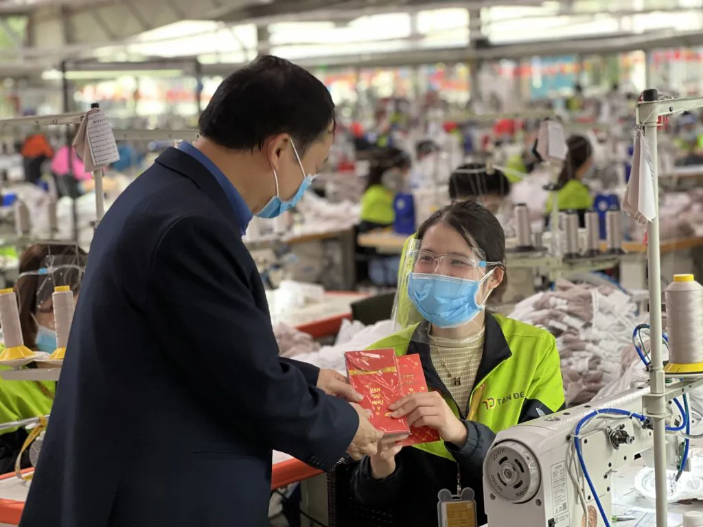 | An executive of Tan De Sports Goods Production JSC gives workers lucky money before they leave for the Lunar New Year holiday in 2023. Photo courtesy of the company |