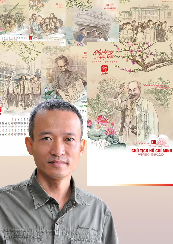 Hanoi artist To Minh Trang and his collection of graphic paintings on the theme of President Ho Chi Minh. Photo: CAND