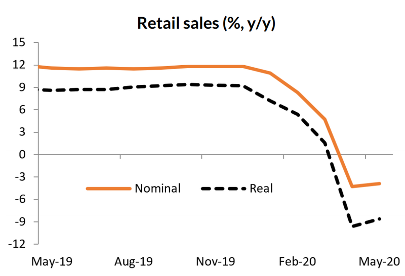 Retail sales also bounced back significantly in May. Both passenger and cargo transportation activities rose by 116% and 32% between April and May as a result of the easing of domestic mobility restrictions that started on April 23. This recovery is corroborated by the Google mobility indicators that, on average, rose from minus 30% to only minus 5% in comparison to the pre-Covid benchmark between mid-April and the week of May 25.