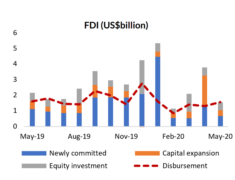 Foreign direct investment (FDI) continued to flow into Vietnam during May but at a slower pace than reported in April. In the first five months of 2020, the total value of committed FDI amounted to US$13.9 billion – still significant but equivalent to a year-on-year decrease of 17%.