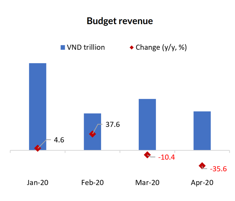The fall in domestic revenue aggravated in April when the state collected nearly 25% less than the previous month or only 65% of the figure recorded in April 2019. The General Department of Taxation has received more than 90,000 applications for postponement of tax and land use fee payments, worth totally VND26.2 trillion (US$1.12 billion).