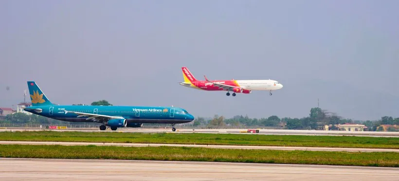 Aircraft from various airlines take off and land at an airport. Photo: VNA