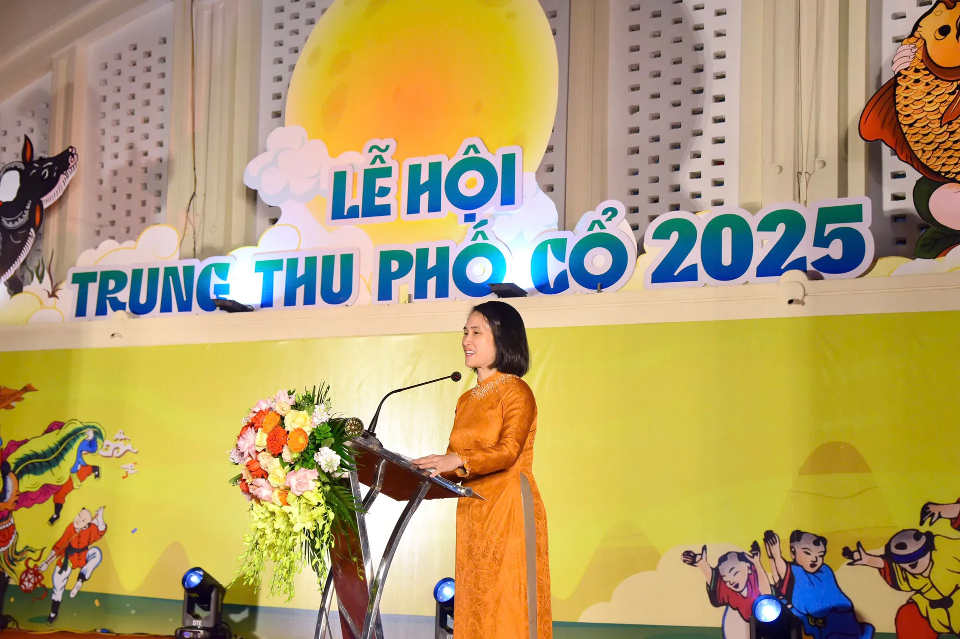 Nguyen Hong Trang, Vice Chairwoman of the Hoan Kiem Ward People’s Committee and Head of the Organizing Committee delivers a speech at the opening ceremony of 2025 Old Quarter Mid-Autumn Festival.