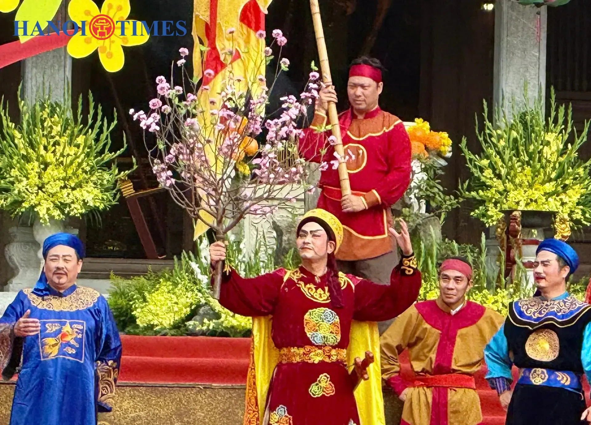 Actors recreate the fifth day of Tet in 1789, when Tay Son troops entered Thang Long and Emperor Quang Trung sent a peach blossom branch to Princess Ngoc Han.