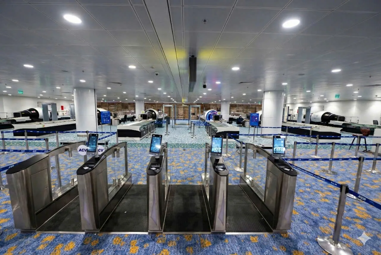 Automated immigration gates with biometric verification streamline entry and exit procedures, while green design features and landscaped areas enhance the passenger experience.