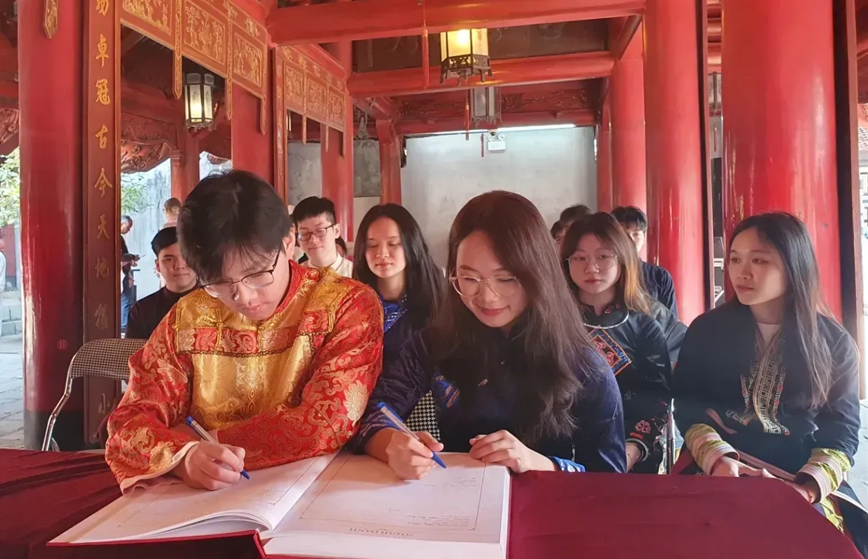 Awarded recipients at the 2024 ceremony sign the Golden Book at the Temple of Literature in Hanoi.
