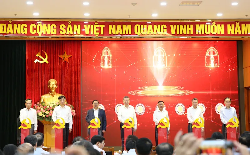 Party General Secretary To Lam, Prime Minister Pham Minh Chinh, and senior Party officials press the button to launch three new digital platforms.