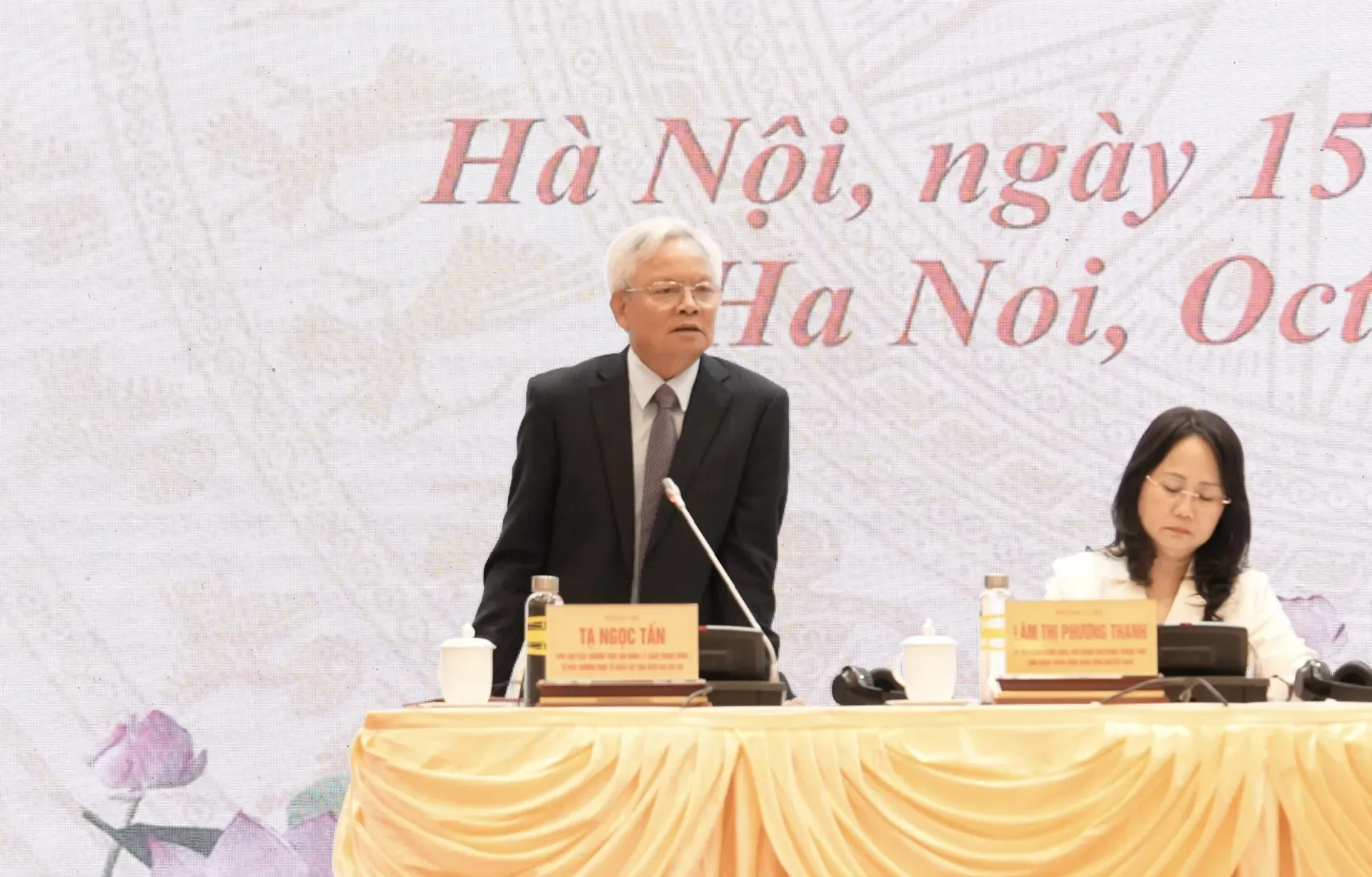 Ta Ngoc Tan, Standing Vice Chairman of the Politburo's Central Theoretical Council, delivers his speech at the international press conference on October 15. Photo: Hong Thai/The Hanoi Times