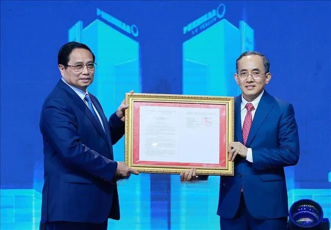 Prime Minister Pham Minh Chinh presents the decision to upgrade the institutional model to Phenikaa University. Photo: VNA