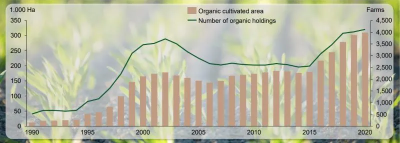 | Data on organic farms and area in Denmark between 1990 and 2020. Photo: Danish Agriculture and Food Council |