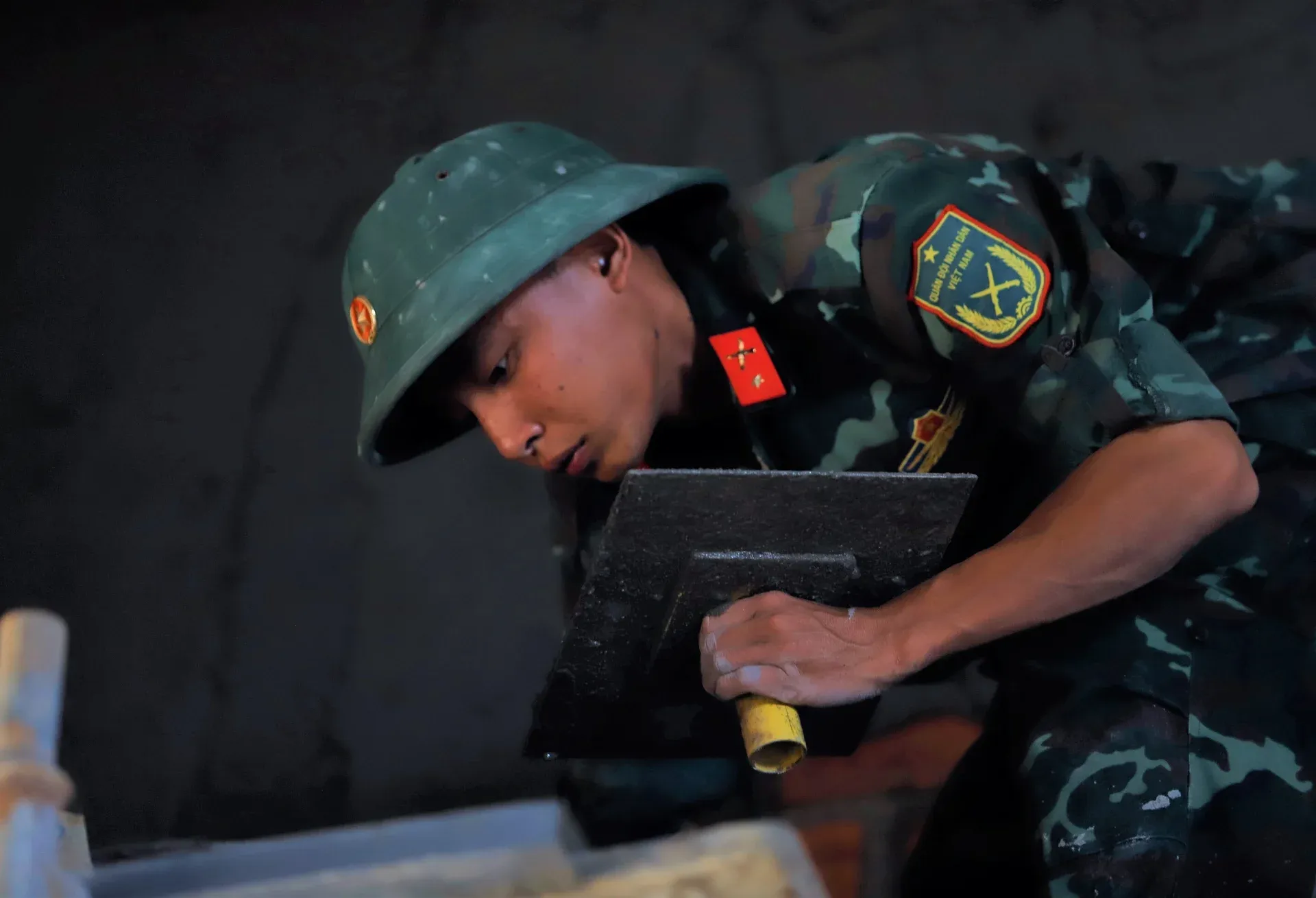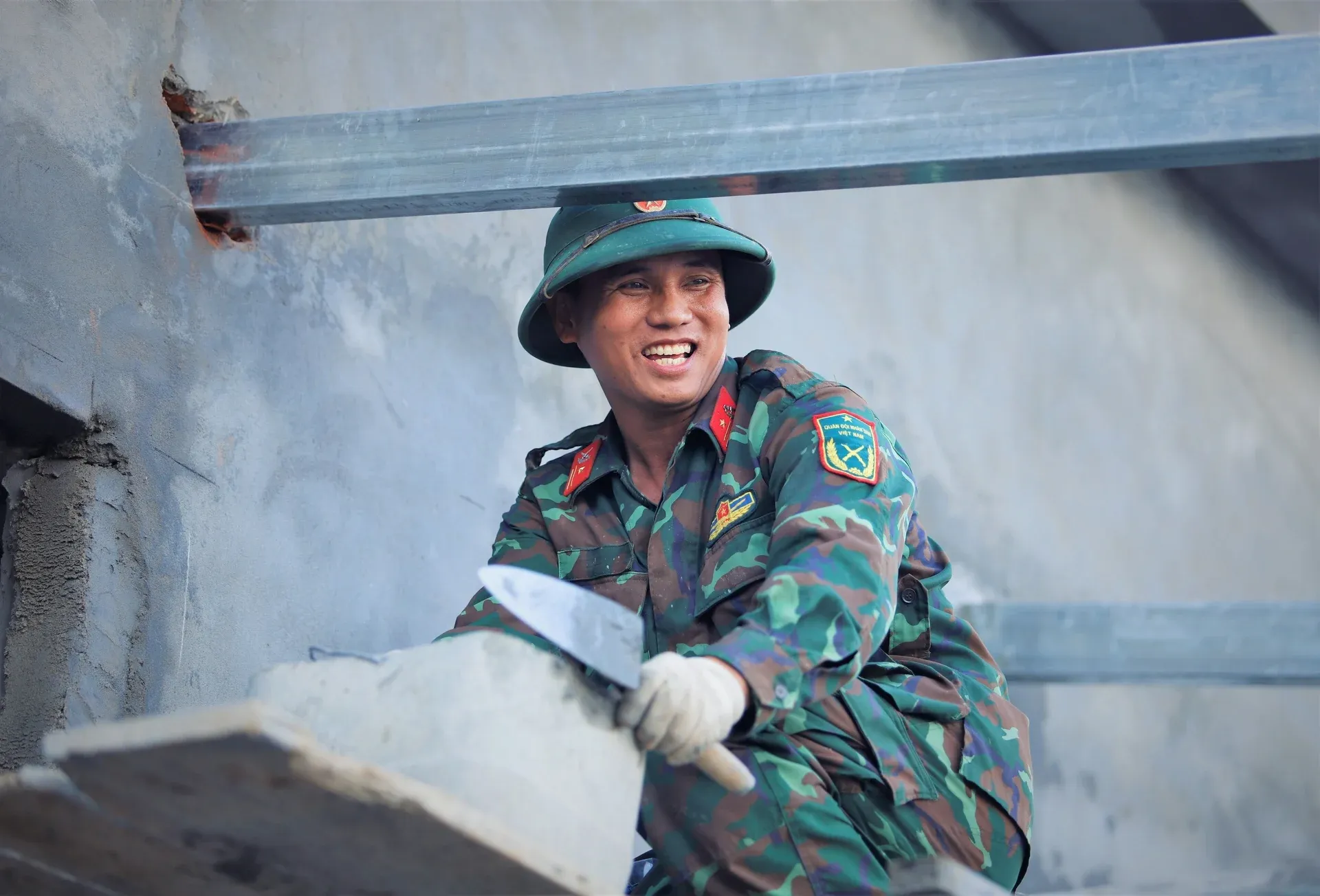 A soldier works on housing construction under the Quang Trung Campaign.