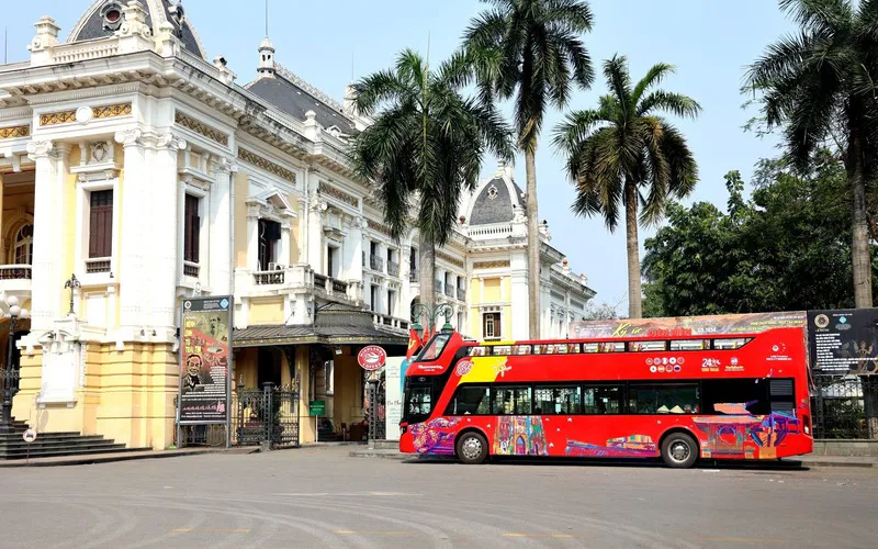 In the sweltering heat, Hanoi's tourist attractions are almost empty, even though it is a national holiday. A double-decker hop-on hop-off bus from Sightseeing Tour in Hanoi waits for visitors near the Opera House, but there is no one. Photo: VGP |