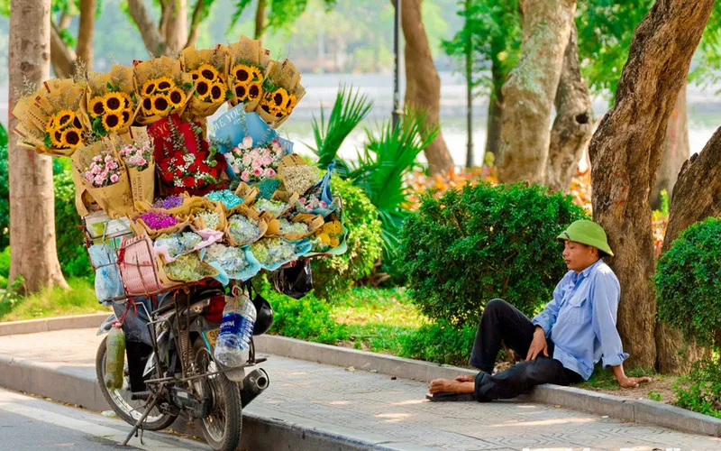 A flower seller takes a short nap in the shade of the trees. Photo: Duy Khanh/The Hanoi Times |