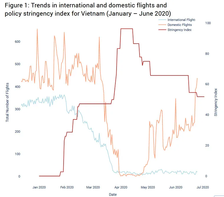 While our dashboard can be used for any country, we will apply it to Vietnam – a country well advanced in its fight against Covid-19. In recent weeks, the government has lifted almost all domestic preventive measures and reopened most domestic flights (Figure 1). As recently mentioned by the prime minister, the authorities are also considering reopening a number of international routes even if the current number has remained extremely limited.