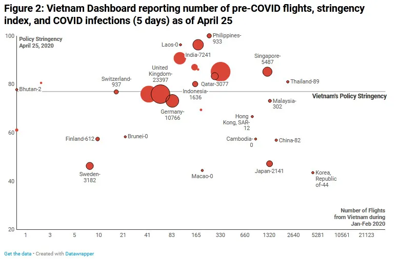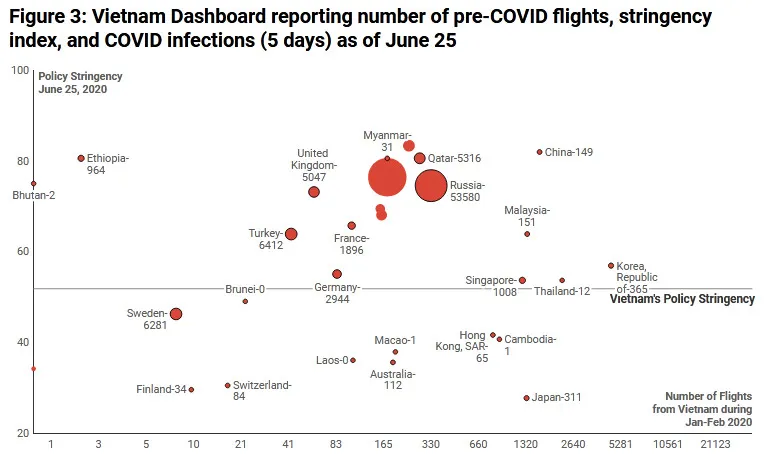 Let us illustrate how our dashboard can help Vietnamese policy makers in two ways. First, it establishes a ranking of countries with respect of the three criteria defined above at a specific point in time. For example, Figure 2 (which is a snapshot of our dashboard) shows the results we obtained on April 25, where the x-axis denotes the number of international flights originating from Vietnam in January and February 2020 prior to the lockdown, while the y-axis is the latest policy stringency. The size of the bubble denotes the number of newly reported cases in the past five days.