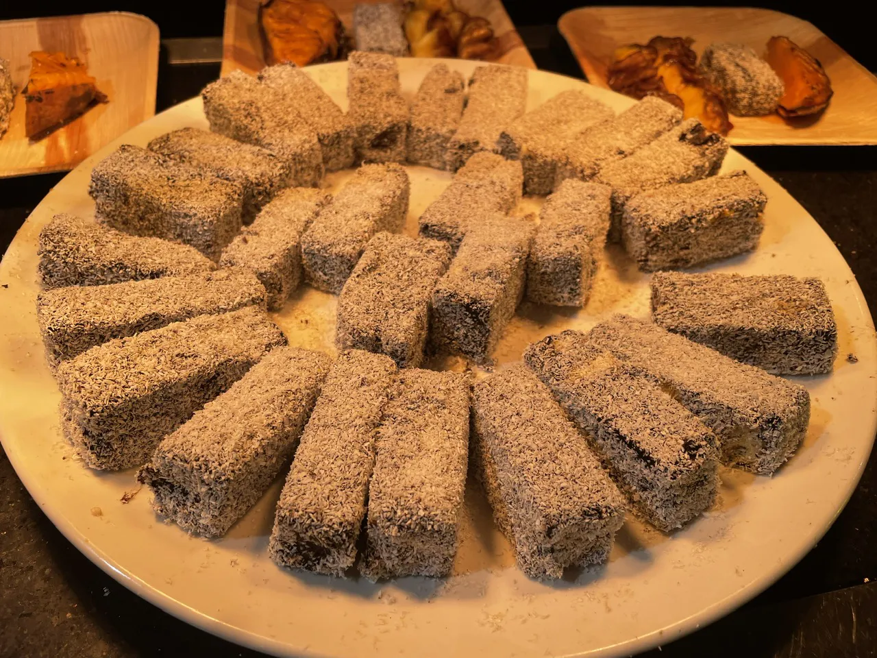 | Lamington - an Australian cake made from squares of butter cake or sponge cake coated in an outer layer of chocolate sauce and rolled in desiccated coconut - becomes one of dinners' favorite. |