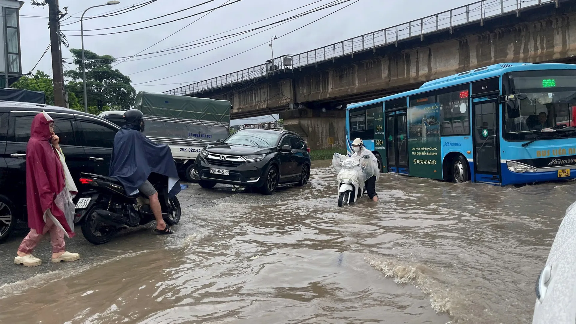 Hanoi people struggle as heavy rain floods urban roads
