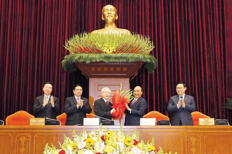 Prime Minister Nguyen Xuan Phuc presents flowers and congratulates Mr. Nguyen Phu Trong on his election as General Secretary of the Central Committee of the Communist Party of Vietnam- the 13th tenure.