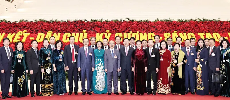 National Assembly Chairwoman Nguyen Thi Kim Ngan poses with the Hanoi delegation for photos.