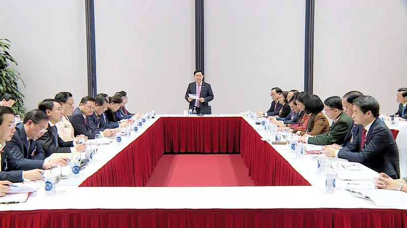 Party Secretary Vuong Dinh Hue discusses with delegates from Hanoi.