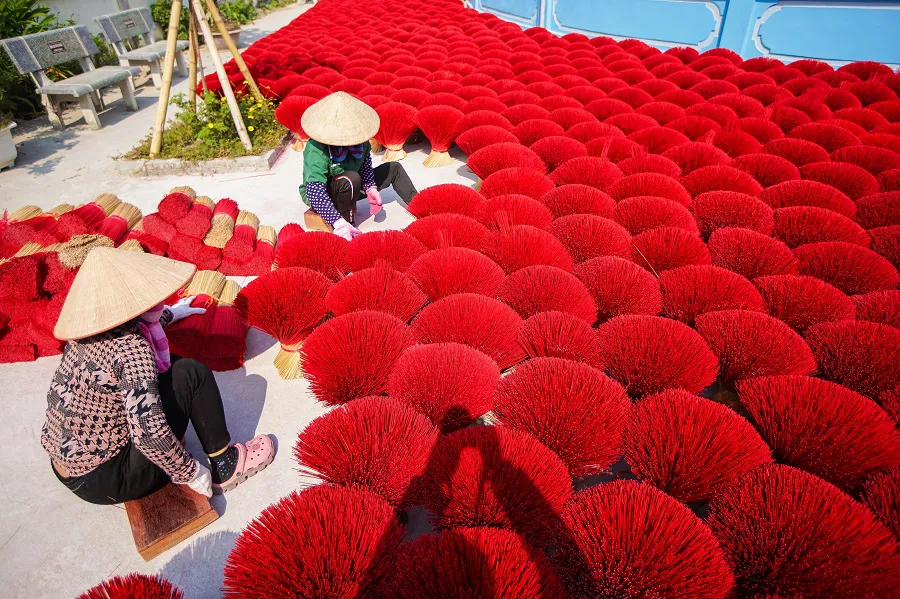 The route then leads to Quang Phu Cau Village, where drying incense sticks glow red, and tradition is tangible in scent, touch and the skilled hands shaping each stick.