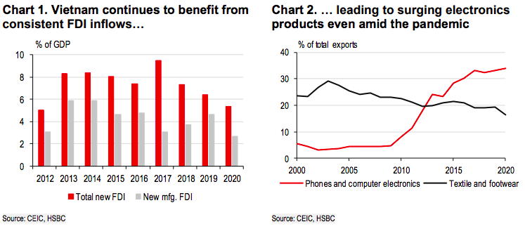 Supply chain diversion has increased tech giants’ interests in Vietnam, a trend that may have been stalled but not stopped by Covid-19, according to HSBC’s report.