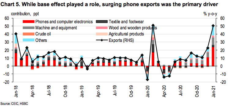 This is particularly evident in Vietnam’s January exports, growing 50.5% year-on-year. While this was in part due to Tết distortions, the primary driver of growth was booming smartphone exports (+115% year-on-year), given the recent release of Samsung’s flagship Galaxy S21.