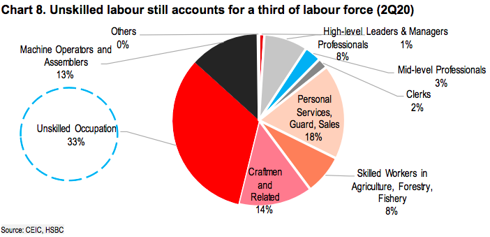 After all, a large proportion (33%) of workforce is still in “unskilled” occupation, as there remains a lack of qualified workers to advance to higher positions. Thus, measures like improving tertiary education and developing industry-specific training programs for technical workers are just some of the examples needed to better equip its human resources.