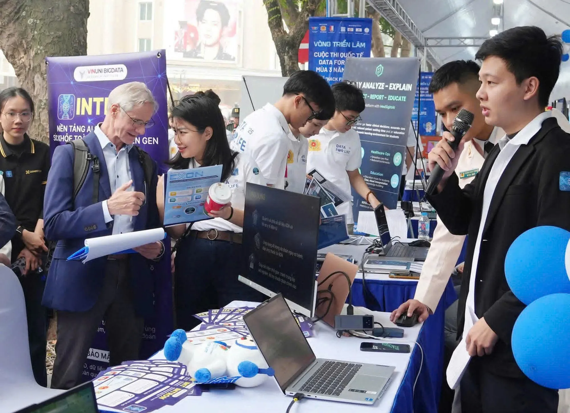 Foreign and local visitors explore Vietnam's pioneering AI technology at the Sphinx JSC booth.