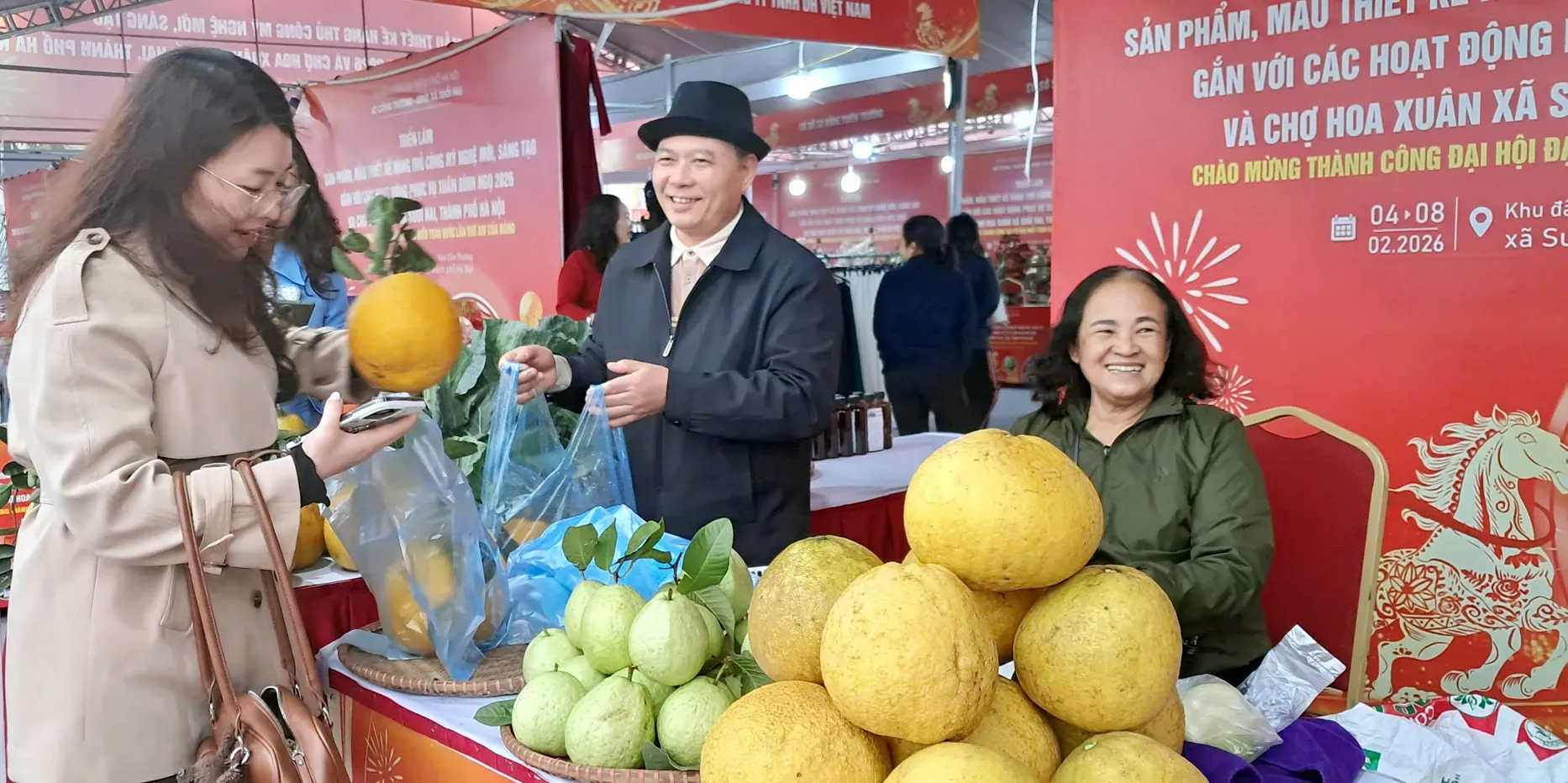 The exhibition combines product displays with cultural and traditional activities associated with Tet, creating a festive atmosphere while promoting domestic consumption in outlying districts of Hanoi.