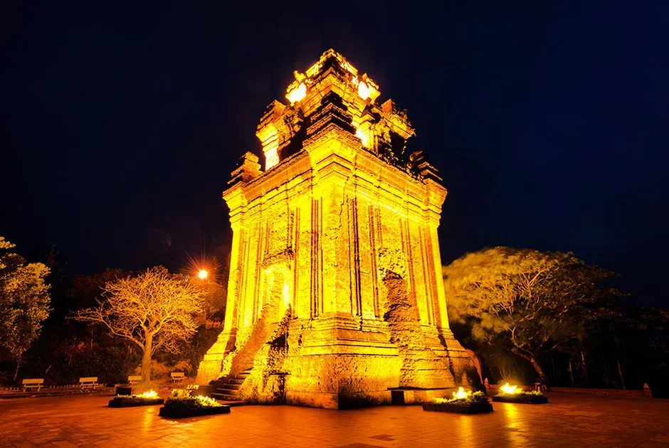 Nhan Tower stands quietly at the heart of Tuy Hoa. From Mount Nhan on a spring night, the coastal city glows below, blending ancient calm with modern life. Photo: Dak Lak Tourism