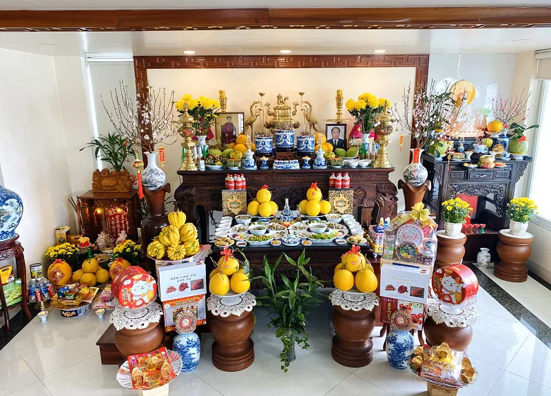 Accordingly, the altar is cleaned and an offering tray of traditional food, fruits and votive paper is put there, aimed to “invite” the ancestors and deities to enjoy the best dishes for the occasion.
