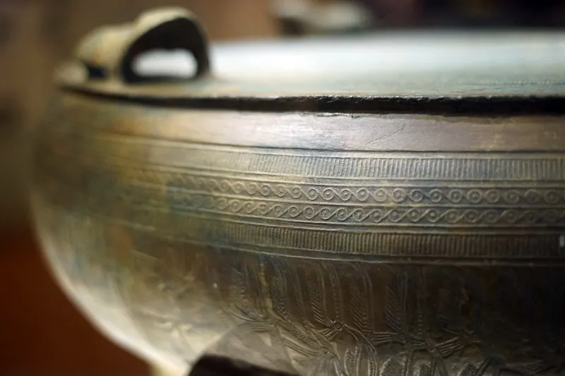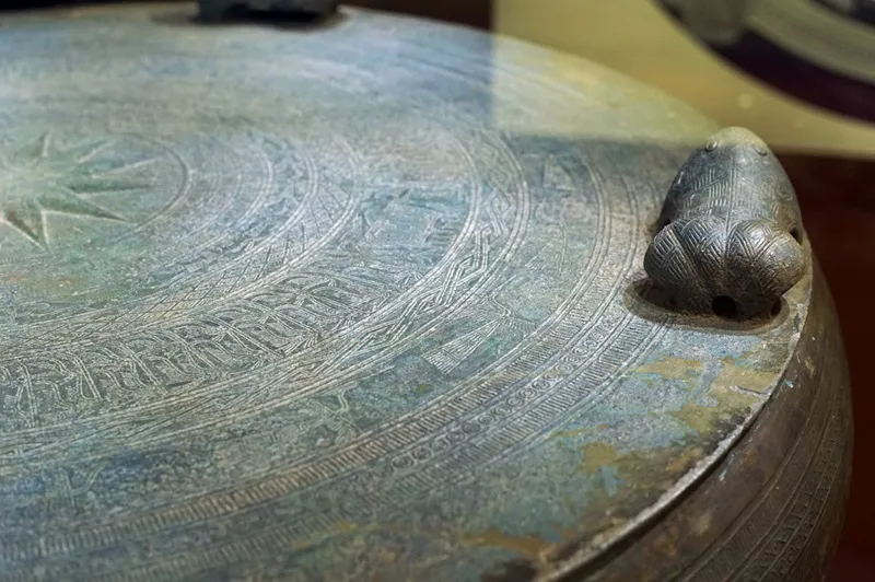 The drum head bears a 12-pointed star in the center adjacent to concentric bands decorated with N-shaped patterns, double circles, short parallel lines, multi-layered rhomboids, and others. The patterns are common to Dong Son bronze drums of the same period and vividly depict the daily life of ancient Vietnamese people.