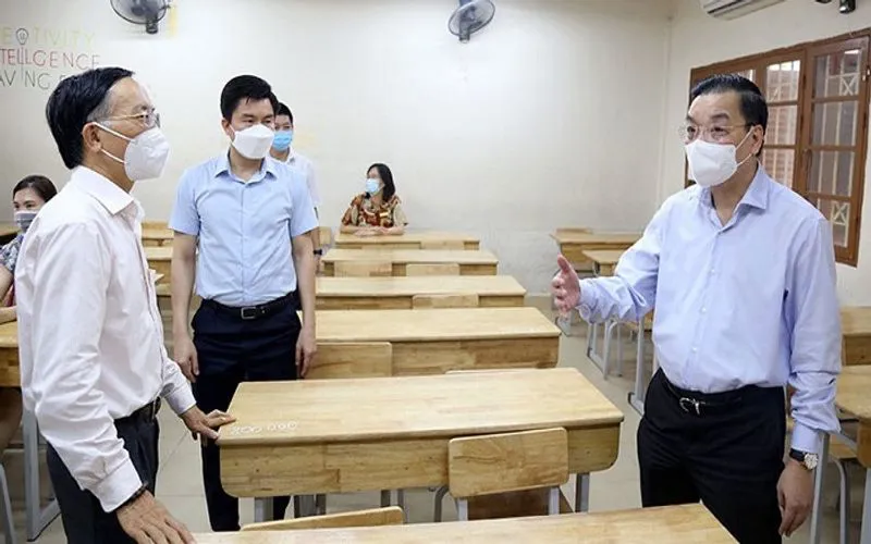 Chairman of the Hanoi municipal People's Committee Chu Ngoc Anh (right) inspects the Covid-19 prevention for the 10th grade entrance exams at Kim Lien High School, Dong Da District on June 7. Photo: Nguyen Trang |