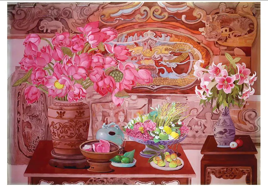 Meanwhile, Vu Thuy Mai’s Cam Thuc Mua Xuan (Sense of Spring) evokes the gentle mist of spring through soft strokes on silk, capturing the poetic aura of the communal house at dawn.