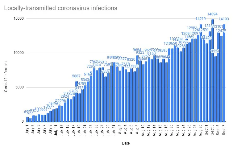 Half of Vietnam’s 14,208 Covid-19 infections detected on Sept 7 are from Ho Chi Minh City and 80% of 316 daily deaths recorded there. So far, 94% of the city’s adults aged above 18 get the first jabs.