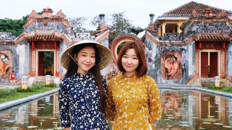 | Charming Korean travelers in Vietnamese ao dai and conical hat. Photo: VNAT |