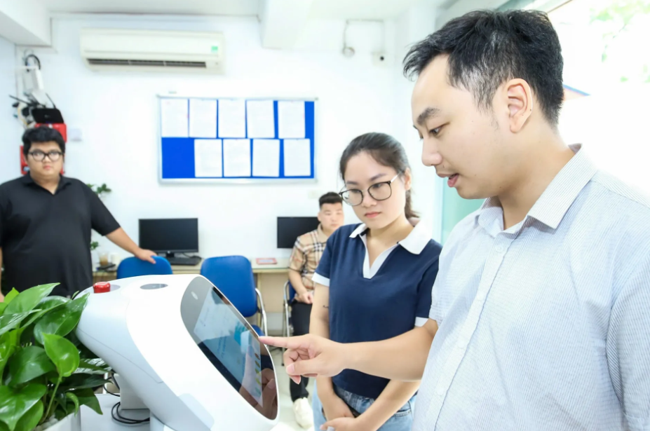 Residents of Cua Nam Ward experience completing administrative procedures with an AI-powered robot. Photo: Khanh Huy/The Hanoi Times