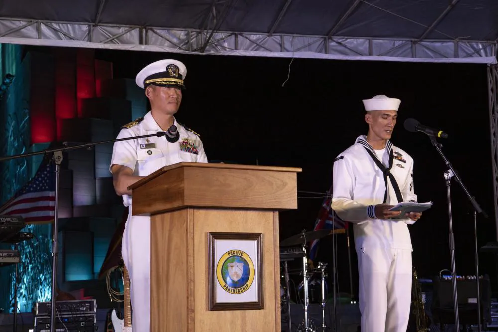 Captain Hank Kim, Pacific Partnership 2022 mission commander (L) delivers remarks during the Pacific Partnership Vietnam opening ceremony. |