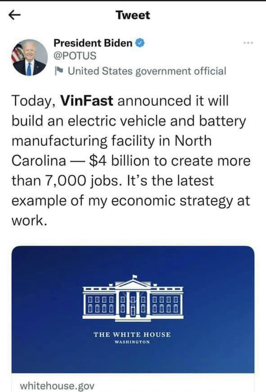 US President Biden tweeted on March 29: “Today, Vinfast announced it will build an electric vehicle and battery manufacturing facility in North Carolina - US$4 billion to create more than 7,000 jobs. It’s the latest example of my economic strategy at work.”