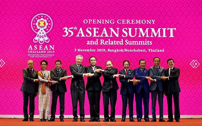 | ASEAN leaders shake hands at the Opening Ceremony of the 35th ASEAN Summit in Bangkok, Thailand, November 3, 2019. |
