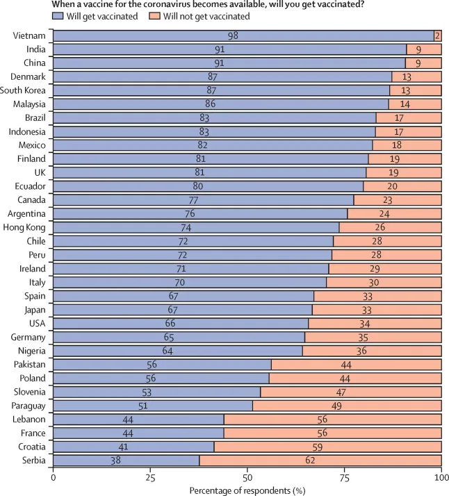 | Vaccine acceptance rate in Vietnam and other countries. Source: The Lancet |
