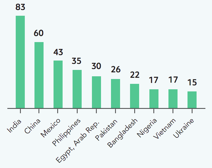 India claimed the top spot in the top 10 with an estimated of US$83 billion, followed by China with US$60 billion and Mexico with US$43 billion.