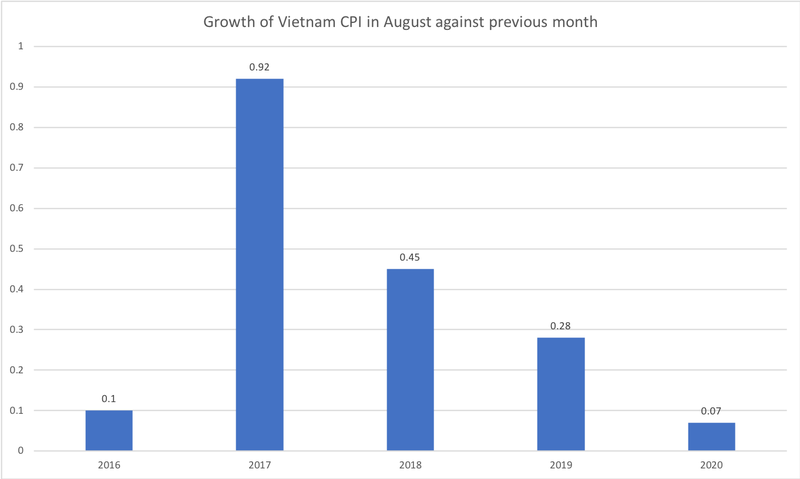 Vietnam's consumer price index (CPI), the main gauge of inflation, in August increased 0.07% against the previous month, but dipped 0.12% versus the end of 2019, both at the weakest levels in the 2016 – 2020 period, according to the General Statistics Office (GSO).